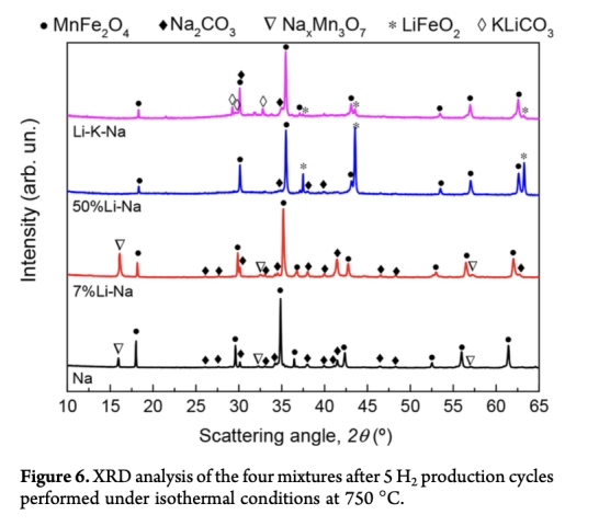 該研究探討了用不同共晶/共析堿金屬碳酸鹽混合物替代鈉錳鐵氧體熱化學(xué)水分解循環(huán)中的Na?CO?的效果。實(shí)驗(yàn)表明,使用共析混合物(Li?.??Na?.??)?CO?時(shí),首次循環(huán)后氫氣生成速度更快,但所有混合物的氫氣產(chǎn)量隨循環(huán)次數(shù)顯著下降。研究發(fā)現(xiàn),碳酸鹽的部分熔化促進(jìn)離子擴(kuò)散,但熔融碳酸鹽導(dǎo)致燒結(jié)現(xiàn)象加劇,降低循環(huán)可逆性。純Na混合物表現(xiàn)出最高的氫氣生產(chǎn)可逆性,而高Li或含K的混合物在首次循環(huán)后幾乎無(wú)氫氣生成。