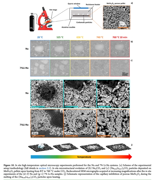 原位光學(xué)顯微術(shù):觀察熔融碳酸鹽對(duì)多孔MnFe?O?的潤(rùn)濕行為(圖10)。