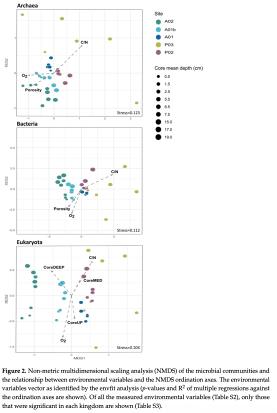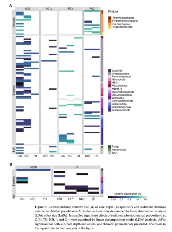 該研究分析了珠江口(PRE)及鄰近陸架沉積物中細(xì)菌、古菌和真核生物的組成、多樣性及分布模式,探討了環(huán)境參數(shù)(如氧濃度、氮化合物、碳含量)對微生物群落的影響。研究發(fā)現(xiàn),微生物群落結(jié)構(gòu)主要受采樣點(diǎn)位置和沉積物核心深度驅(qū)動,兩者共解釋了約67%的群落變異。不同站點(diǎn)和深度的沉積物特性(如有機(jī)質(zhì)含量、氧化還原條件)導(dǎo)致特定微生物類群與化學(xué)參數(shù)(如C/N比、NH4+濃度)顯著相關(guān)。盡管存在差異,各站點(diǎn)均存在優(yōu)勢類群(如細(xì)菌中的Gammaproteobacteria,古菌中的Bathyarchaeia)。P03站點(diǎn)的微生物多樣性(三個類群)顯著低于其他站點(diǎn)。