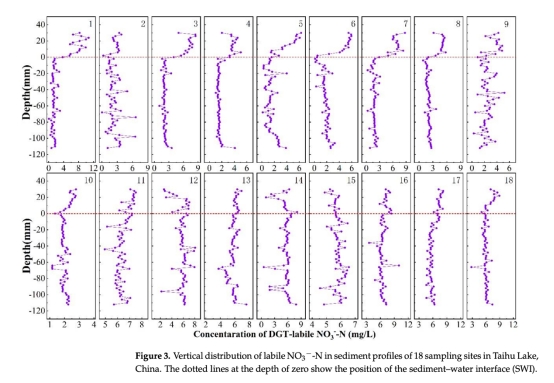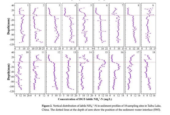 原位觀測:在太湖18個采樣點采集沉積物,使用DGT和HR-Peeper技術獲取SWI處NH4+-N、NO3--N的高分辨率垂直分布數據(圖2、3)。