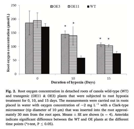 使用丹麥Unisense微電極直接測量根細胞氧濃度,轉基因植株在10天和15天低氧脅迫下氧濃度顯著高于WT。