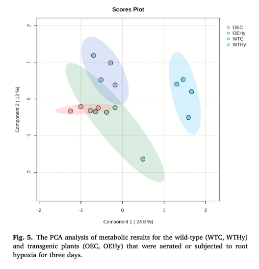 轉基因植株在低氧下增強糖酵解、丙酮酸代謝和TCA循環,而WT轉向氨基酸代謝。