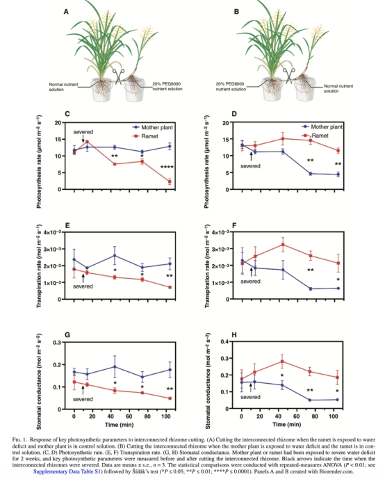 生理整合實(shí)驗(yàn):通過(guò)切斷母株與分株間的根莖連接,測(cè)量光合參數(shù)(光合速率、蒸騰速率、氣孔導(dǎo)度)的變化,驗(yàn)證根莖在水分脅迫下的雙向資源傳輸能力(圖1)。