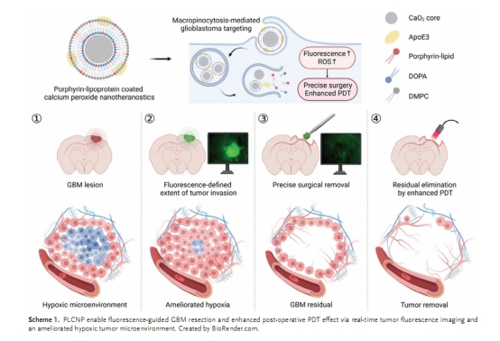 論文提出了一種自拆卸產氧的卟啉脂蛋白納米顆粒(PLCNP),用于膠質母細胞瘤(GBM)的熒光引導手術(FGS)和增強光動力治療(PDT)。PLCNP通過巨胞飲作用靶向GBM,其CaO?核心減少卟啉脂質的自淬滅效應,提高熒光強度;同時,CaO?在酸性溶酶體中分解產氧,緩解腫瘤缺氧微環境,增強PDT療效并抑制缺氧誘導的腫瘤進展。