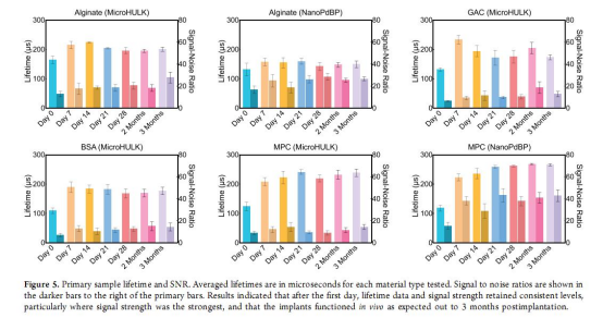 所有傳感器在體內(nèi)均表現(xiàn)出穩(wěn)定的氧敏感性,信號持續(xù)超過三個月(圖5、圖6B)。
