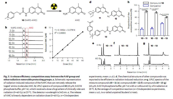 2. 機(jī)制驗(yàn)證:結(jié)合理論計(jì)算和實(shí)驗(yàn)(如自由基捕獲、UPLC-MS分析),揭示NAP通過(guò)捕獲e?aq觸發(fā)C-O鍵斷裂釋放功能分子的機(jī)制(圖2e-f,Extended Data Fig.1)。