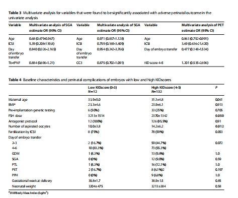 胚胎評分 第3天/第5天KID評分(基于TLMS數據的植入潛力算法) 表2、表4 高KID3分與SGA單變量相關(4.83 vs. 4.50, p=0.027),但多變量分析無意義(表3)。