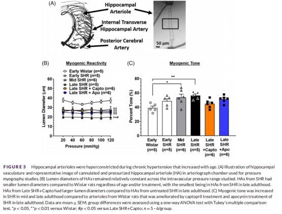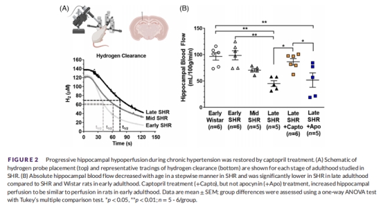 核心發(fā)現(xiàn):慢性高血壓通過血管緊張素II(Ang II)信號通路導(dǎo)致海馬小動脈(HA)功能障礙(內(nèi)皮損傷、過度收縮),引發(fā)海馬低灌注(血流減少50%)和記憶損傷。ACE抑制劑卡托普利可逆轉(zhuǎn)上述病變,而抗氧化劑夾竹桃麻素(Apocynin)無效。