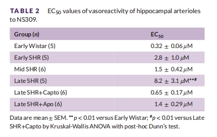 SKCa/IKCa通道功能(NS309反應(yīng)):晚期SHR反應(yīng)↓(EC50↑,表2),卡托普利完全恢復(fù)。
