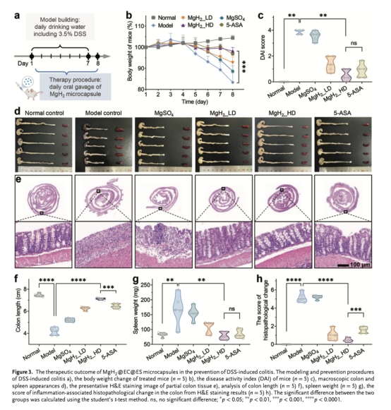 結(jié)腸長度恢復(圖3d, f)、脾臟重量減小(圖3d, g)、組織病理評分改善(圖3e, h):微膠囊效果優(yōu)于5-ASA,且依賴H?釋放(MgSO?@EC@ES無效)。意義:證實微膠囊的優(yōu)越治療效能。