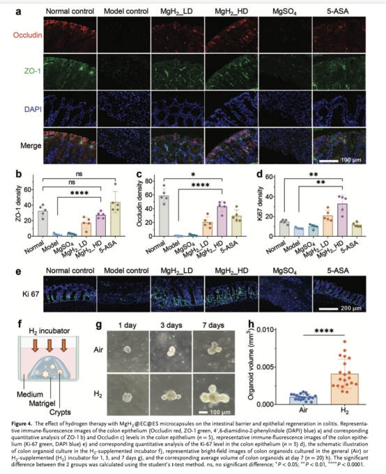 腸道屏障修復(圖4):微膠囊上調(diào)緊密連接蛋白(ZO-1, Occludin)表達,促進腸上皮細胞增殖(Ki-67)和類器官生長(圖4g-h),意義:揭示H?促進黏膜修復的細胞機制。