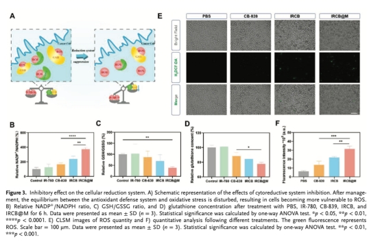 IRCB@M通過阻斷谷氨酰胺代謝,同步實現"節氧"(減少腫瘤耗氧)和"耗竭還原物質"(降低GSH/NADPH),雙重增強PDT的ROS殺傷效率。