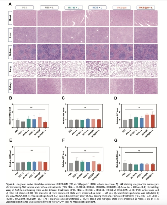 尺寸、電位、UV光譜、TEM形貌:證明IRCB@M成功制備且穩定(圖1A-B, F如下)。