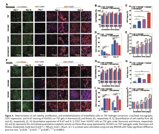 HUVECs存活與內皮化(圖4B,D,G,I):在缺氧條件下,TSF/OMP/SDF顯著提升細胞存活率(>90%)和CD31表達。意義:證明水凝膠在缺氧微環境中促進血管生成。