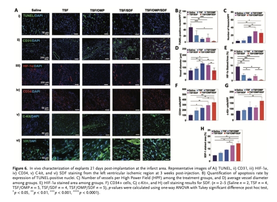 凋亡率(圖6B):TSF/OMP/SDF組TUNEL?細胞<5%(對照組≈20%)。意義:顯著保護心肌細胞免于凋亡。