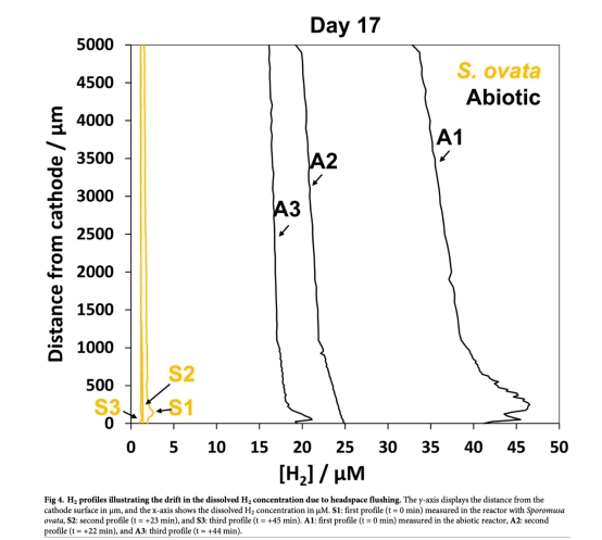 高分辨率動態監測:Unisense微傳感器以25 μm步進分辨率捕捉陰極附近H?梯度(圖3),首次直接證實 S. ovata 在陰極表面高效消耗H?(濃度始終<4 μM),而傳統GC僅能檢測頂空氣體,無法反映液相微環境動態。