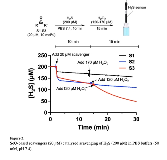 驗(yàn)證催化循環(huán):通過(guò)H?O?添加后H?S的持續(xù)消耗(圖3中S3),證實(shí)硒化合物的催化再生能力。