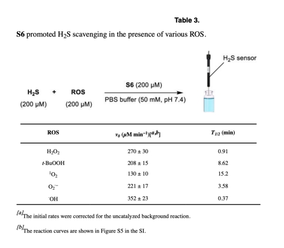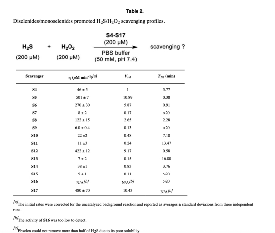 二硒化物(如S6)在ROS存在下可催化清除H?S和H?O?,其鄰位氨基結(jié)構(gòu)顯著提升活性(S6的v?=270 μM/min)。