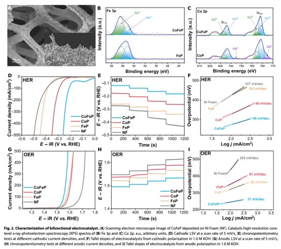 CoFeP雙功能催化劑在100 mA/cm2下法拉第效率達(dá)99%,堿性條件穩(wěn)定運(yùn)行20小時(shí)。