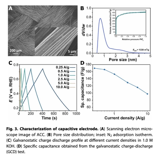 ACC電極比電容(0.25 A/g: 169 F/g)及倍率性能(10 A/g: 97.5 F/g)。