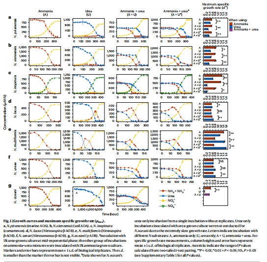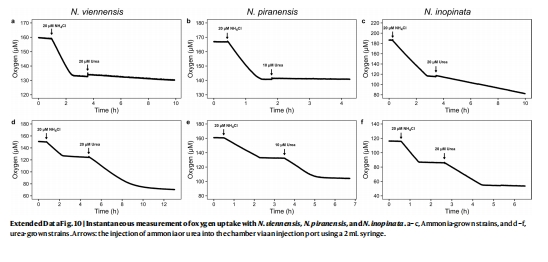 AOA(N. piranensis, N. viennensis)和comammox(N. inopinata)先耗盡氨后才利用尿素(存在雙峰生長(zhǎng))。