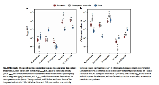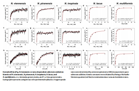 數(shù)據(jù):微呼吸儀(Unisense電極)測(cè)定氨/尿素氧化的米氏常數(shù)(Km(app))和比親和力(a°)。