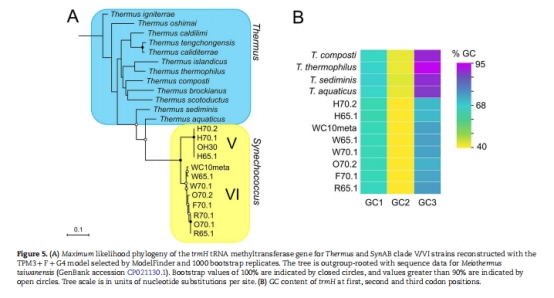 HGT事件 僅少數HGT(如trmH從Thermus轉移),挑戰HGT是嗜熱適應關鍵驅動力的觀點。 Fig. 4, 5