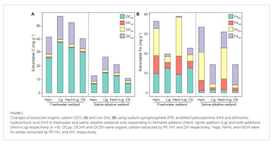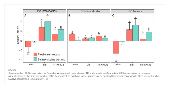 摘要指出:鐵氧化物(Fe)可通過吸附和共沉淀穩(wěn)定有機(jī)碳(OC),但微生物鐵還原會(huì)破壞鐵結(jié)合有機(jī)碳(Fe-OC)并促進(jìn)OC礦化。本研究通過向淡水和鹽堿濕地土壤中添加結(jié)晶鐵氧化物(赤鐵礦,Hem)和老舊碳(褐煤,Lig),探究兩者對(duì)OC平衡的影響。結(jié)果顯示: