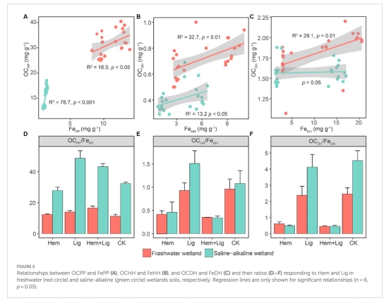 Lig促進(jìn)Fe-OC形成,導(dǎo)致OC凈積累(淡水濕地:5.9±3.6 mg g?1;鹽堿濕地:8.3±3.2 mg g?1)。
