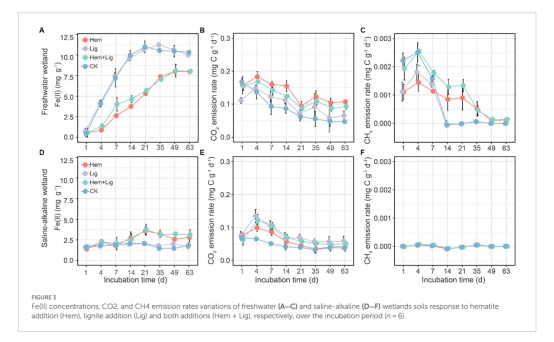 意義:反映微生物鐵還原活性和OC礦化強(qiáng)度。Hem在淡水濕地中導(dǎo)致最高CO?排放(圖3B),證實(shí)其促進(jìn)OC礦化。
