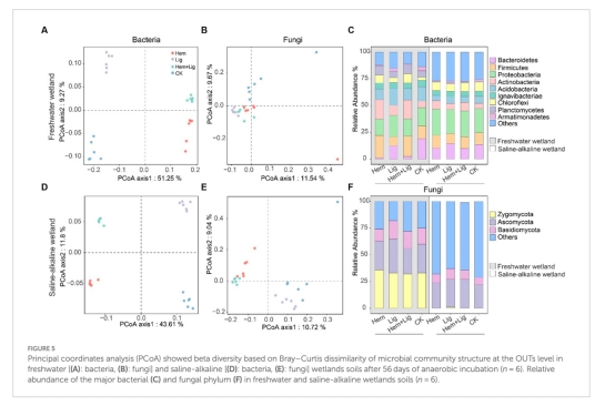 負(fù)面效應(yīng):單獨(dú)添加結(jié)晶鐵氧化物(Hem)通過改變微生物群落(富集放線菌和厚壁菌)增加OC礦化,導(dǎo)致淡水濕地OC凈損失。