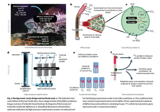 從東太平洋海?。‥PR)采集Riftia pachyptila,在高壓呼吸儀(HPRS)中模擬原位溫壓和地球化學條件(圖1d-f)。