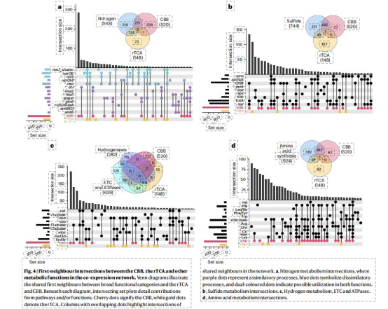 rTCA與氫化酶(Hyd1e)、異化硝酸鹽還原(norCB,nosZ)強關聯(金色/青綠色模塊);CBB與硫氧化(sox,fccA)、同化硝酸鹽還原(narGHI)協同(粉色/櫻桃色模塊)(Fig.5),揭示途徑特異性代謝聯盟。