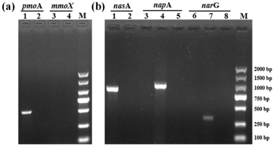 通過PCR確認 Methylobacter sp. YHQ 含 pmoA(顆粒性甲烷單加氧酶基因)和 nasA(同化硝酸鹽還原酶基因),不含異化還原酶基因(napA/narG)(圖1)。
