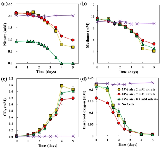 數(shù)據(jù):2 mM NO??下硝酸鹽還原速率0.35 mM/day,CH?氧化速率1.1 mM/day;低氧(40%空氣)時速率分別降至0.24 mM/day和0.87 mM/day。