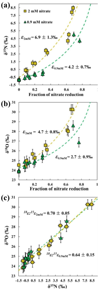硝酸鹽濃度升高增強N-O同位素分餾(1?ε↑, 1?ε↑),因低濃度下 硝酸鹽轉(zhuǎn)運限制 掩蓋分餾效應。