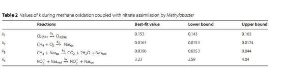動力學建模:構建包含4步反應的模型(O?溶解→CH?氧化→Nas還原→NO??還原),擬合速率常數(shù)(表2)。