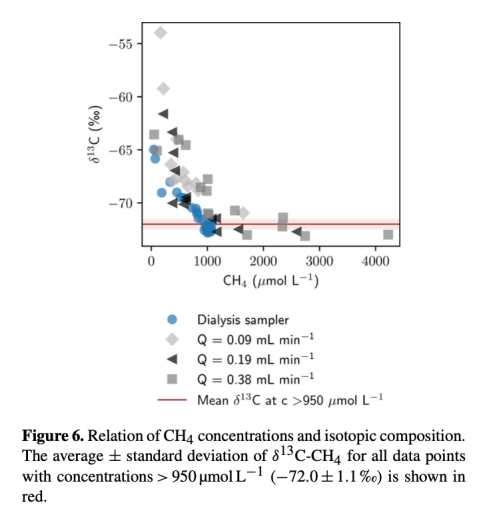 數據:CH?濃度隨抽水速率升高而增加且變異性增大;δ13C-CH?在低濃度(<950 μmol/L)時分餾顯著(最高達-65.9‰ vs. peeper的-71.2‰)。