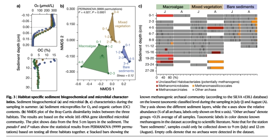 生境機(jī)制差異:大型藻類CH?源于巖石縫隙沉積物和附生微囊產(chǎn)甲烷菌;混合植被和裸沉積物CH?由沉積物古菌主導(dǎo)。