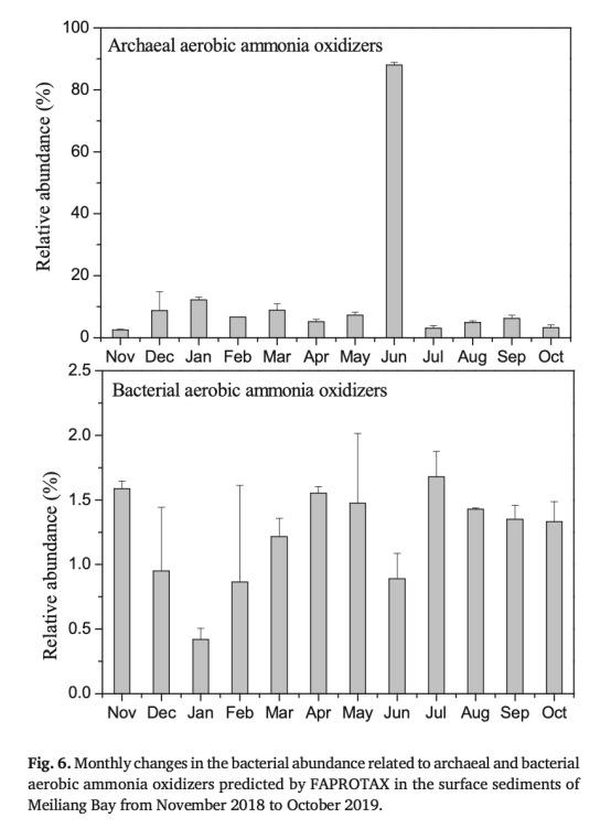 數(shù)據(jù):6月表層沉積物古菌氨氧化菌(Nitrososphaeria)相對豐度達(dá)87.99%,顯著高于細(xì)菌氨氧化菌(<1.2%)。