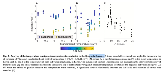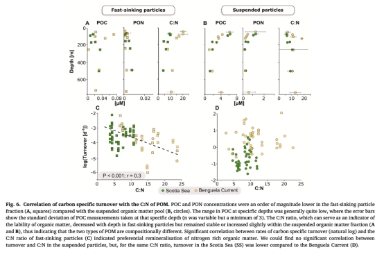 數據:低C:N(富氮)顆粒周轉更快(R2=0.89),本格拉寒流相同C:N下周轉快于斯科舍海。