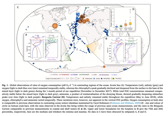 數據:懸浮顆粒耗氧速率(斯科舍海1.12 μM C d?1,本格拉寒流6.4 μM C d?1)比沉降顆粒高4個數量級(0.9 nM C d?1)。