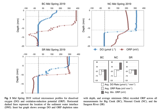 數據:Nissouri Creek在2019年春季中期DO在SWI處驟降(速率-158.4 μmol/L/mm),2 mm深度即達缺氧狀態(<0.3 μM)。