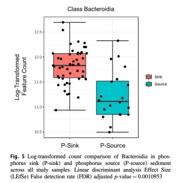 擬桿菌門(Bacteroidia)在磷匯沉積物中豐度更高(LEfSe p=0.001)。