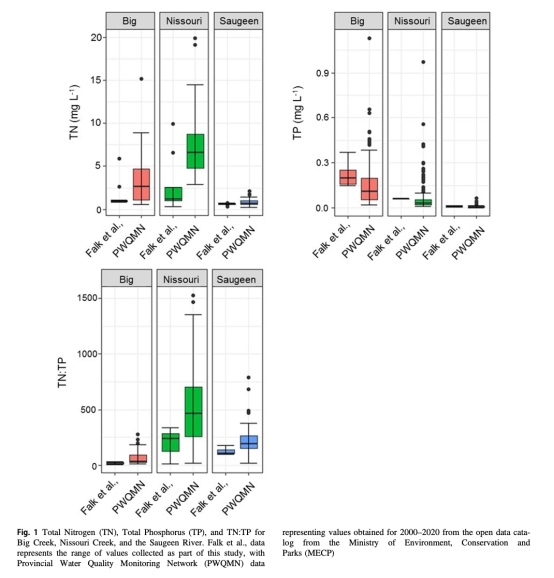 數據:Big Creek總磷(TP)長期偏高(峰值>0.4 mg/L),Nissouri Creek總氮(TN)顯著高于其他站點(>3 mg/L)。