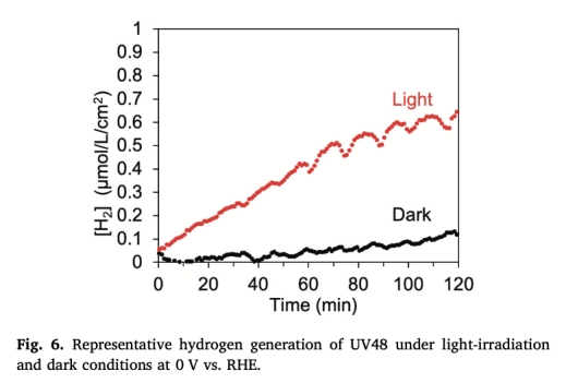 數(shù)據(jù):UV48產氫速率0.63 μmol/cm2/天(0 V vs. RHE),法拉第效率0.09-0.41%(0 V) vs. 48.1-77.6%(-0.69 V)。
