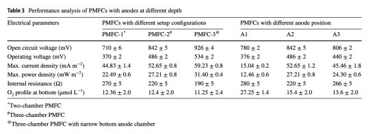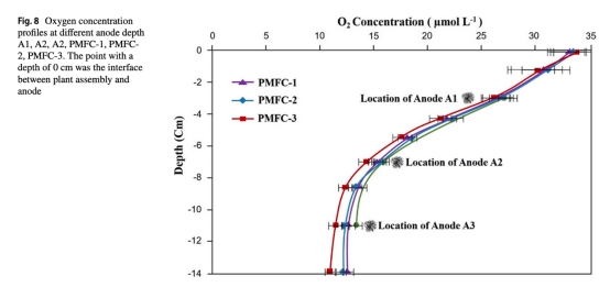 測得A2位置(7 cm深)氧濃度15.4 μmol/L,低于A1(27.25 μmol/L)但高于A3(13.6 μmol/L),結合功率數據(A2 > A3 > A1),證明中度深度(A2)兼顧低氧環境與質子傳遞效率。