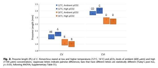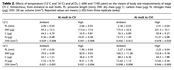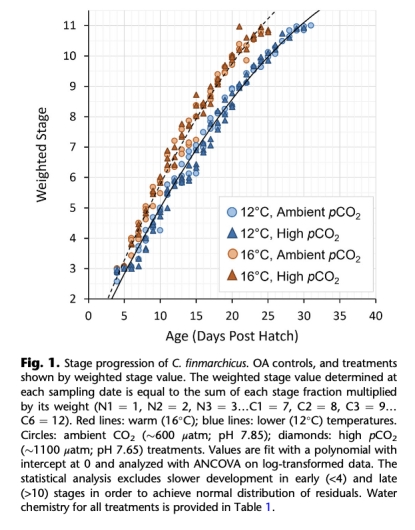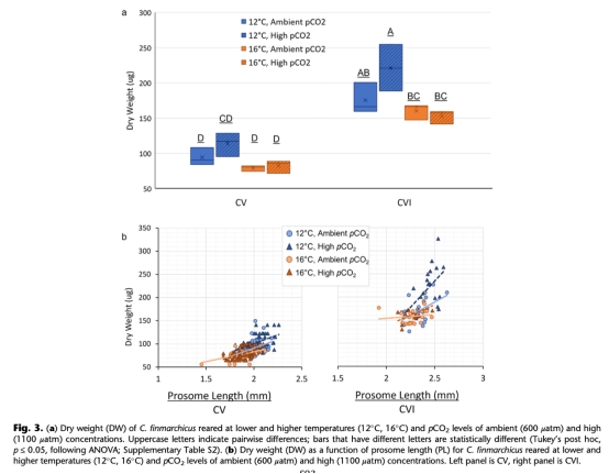 研究在12°C和16°C下,將Calanus finmarchicus從卵培養(yǎng)至成蟲,并暴露于環(huán)境CO?(600 μatm)和高CO?(1100 μatm)條件下。關鍵發(fā)現(xiàn):