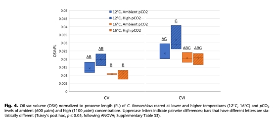 溫度與CO?交互作用:低溫(12°C)+高CO?組合下油囊體積最大(CV期增加41%,CVI期增加39%)(圖4)。