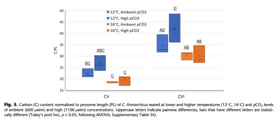 結論:未來海洋酸化(高CO?/低pH)在較低溫度下可能通過降低代謝成本,促進C. finmarchicus的生長和脂質儲備。